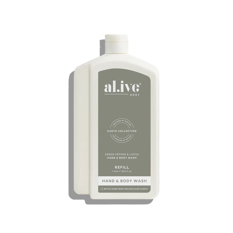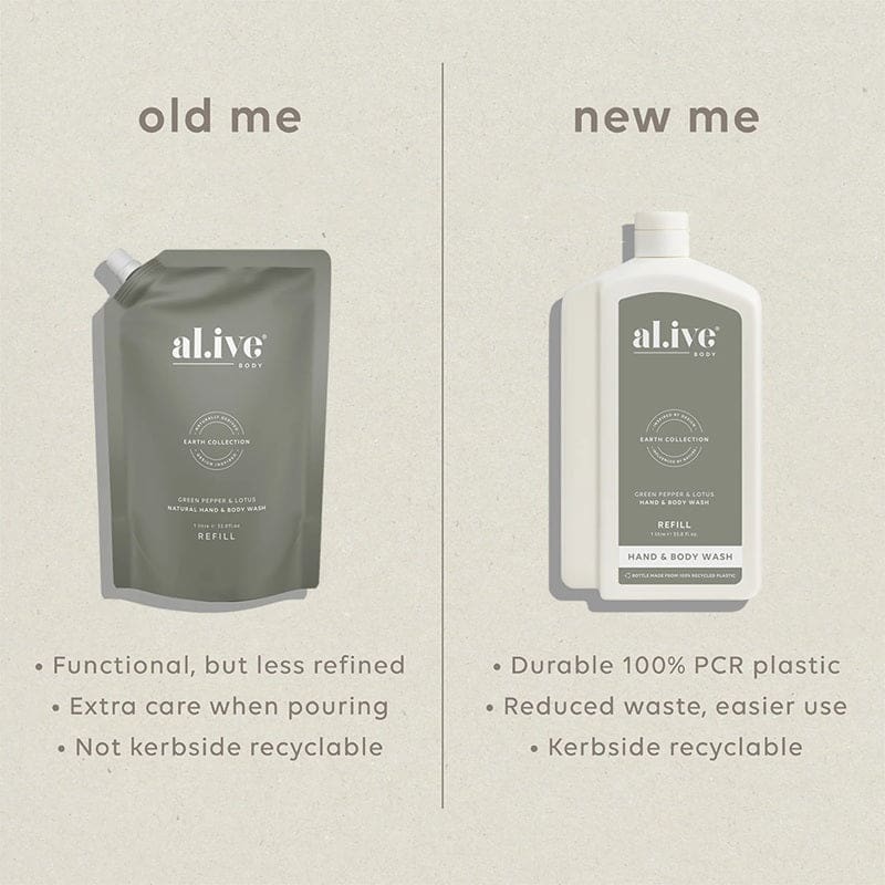 Each refill is designed to refill the 500ml al.ive body Hand & Body Wash bottle twice. With a controlled-flow spout for mess-free pouring, compact shape for easy storage, and full kerbside recyclability, it offers a practical, premium solution while extending the life of the product you already love.