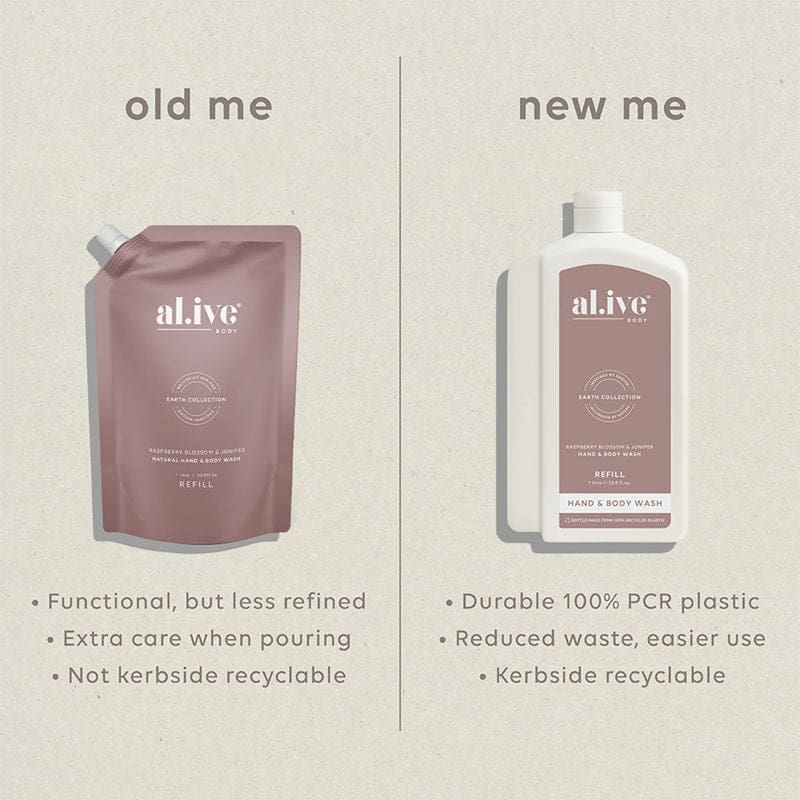 Each refill is designed to refill the 500ml al.ive body Hand & Body Wash bottle twice. With a controlled-flow spout for mess-free pouring, a compact shape for easy storage, and full kerbside recyclability, it offers a practical, premium solution that extends the life of the product you already love.