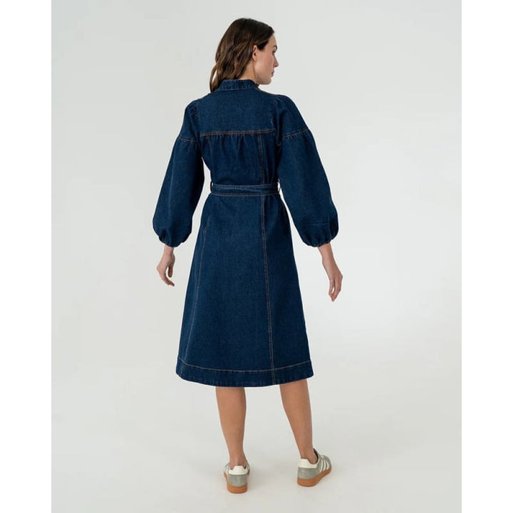 Chic and versatile, the Berkeley Dress is crafted in stretch denim for a comfortable yet polished look. Designed in a flattering A-line silhouette, it features gold centre-front snap buttons and contrast denim stitching for a modern edge. The smooth fit through the shoulders is complemented by slightly blouson sleeves with elastic cuffs for effortless wear, while the self-tie belt allows you to define your waist. Side pockets add a practical touch, making this dress as functional as it is stylish. Perfect for casual outings or elevated daywear, the Berkeley Dress is a timeless wardrobe essential.