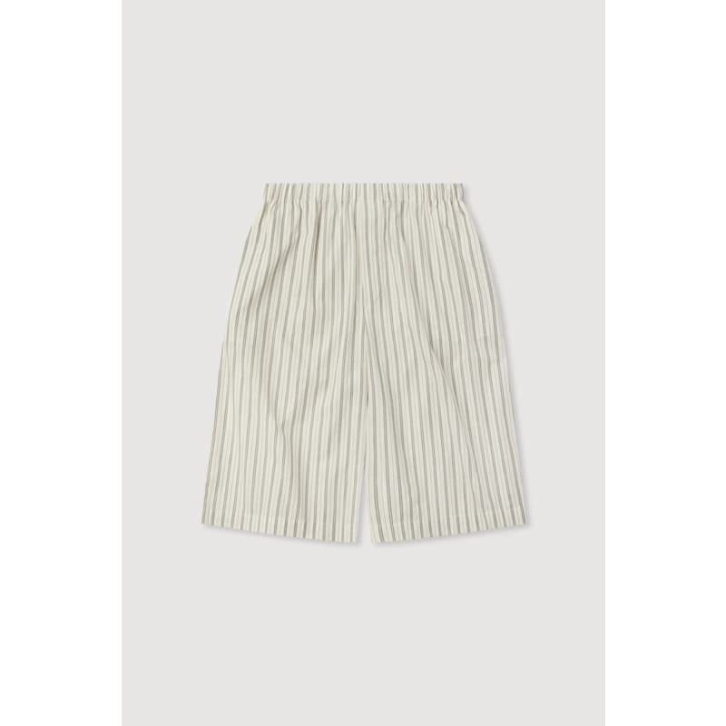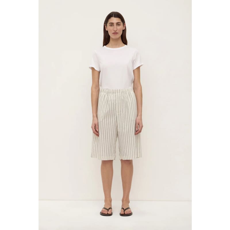 The Ria Stripe Short in Cream/Smoke is a 100% cotton short with an elasticated waistband, side seam pockets, and a back patch pocket.