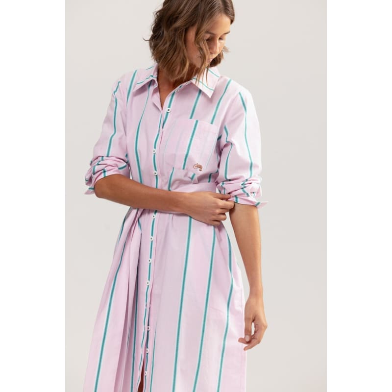 For when you want to look like you’ve made an effort, but absolutely haven’t. This midi shirt dress features crisp baby pink, green & white cotton stripes, as well as a tiny embroidered prawn friend on the front pocket. It’s got pockets (obviously), a removable waist tie (optional, like shoes), and just enough structure to get you from the beach to brunch without raising suspicion. Add a white cord cap. (looks cool, covers terrible hair that hasn't seen a salon for over eight weeks.)