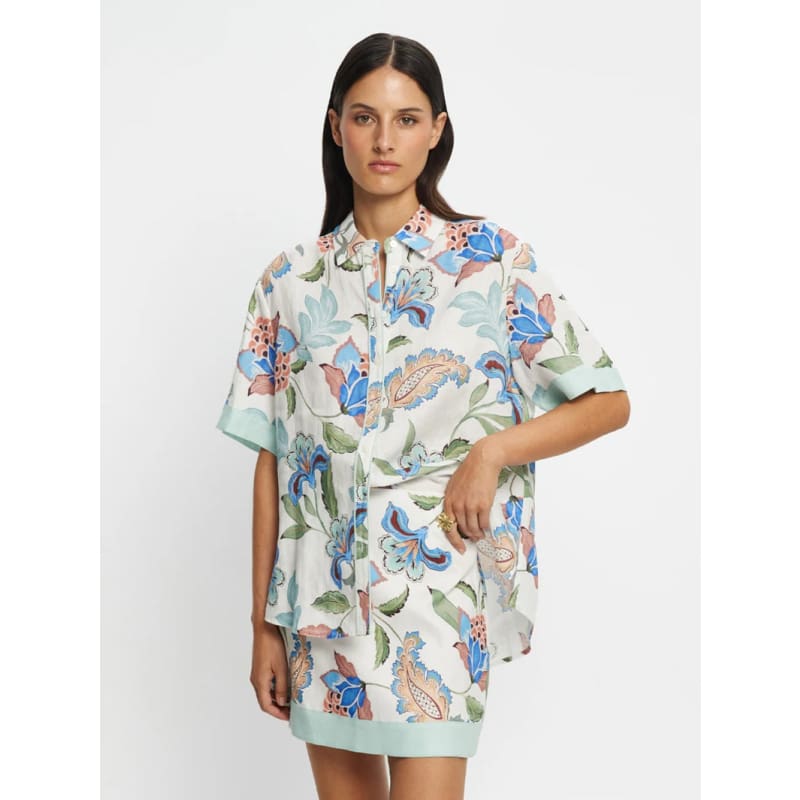 Azure is a hand painted design and is a bold floral print with blue blooms, terracotta accents, and green leaves on a white base. The Azure Mini Skirt features an A-line skirt shape, featuring an exposed back zip and complete with a contrast blue border. Pair this skirt back with the Azure Shirt.