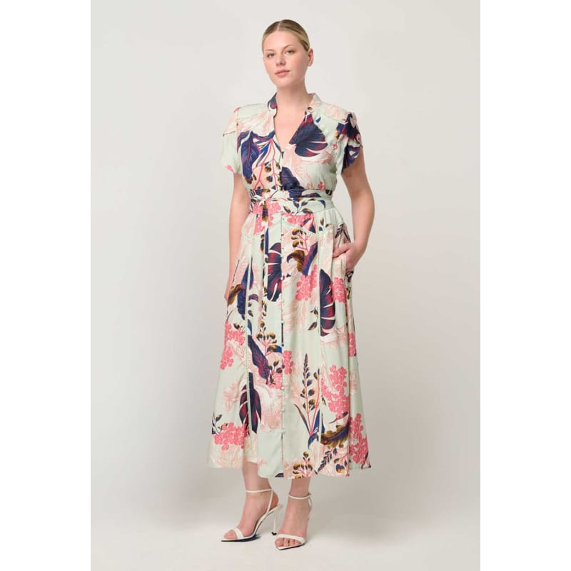 The vibrant Oasis Flora print, featuring a mix of bold botanicals in pink, coral, and deep navy against a soft mint base, captures the essence of modern femininity. A V-neckline and softly capped sleeves offer a flattering silhouette, while the detachable waist tie allows you to cinch your shape or wear it loose for relaxed sophistication. The midi-to-maxi length with subtle volume creates graceful movement, making it equally suitable for daytime events, summer holidays, or evening gatherings.