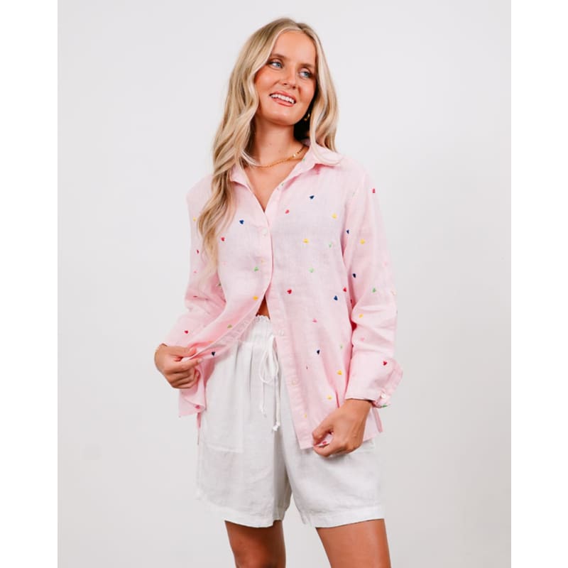 A charming button-up elevated by sweet heart embroidery details, crafted from a lightweight linen that softens with every wear